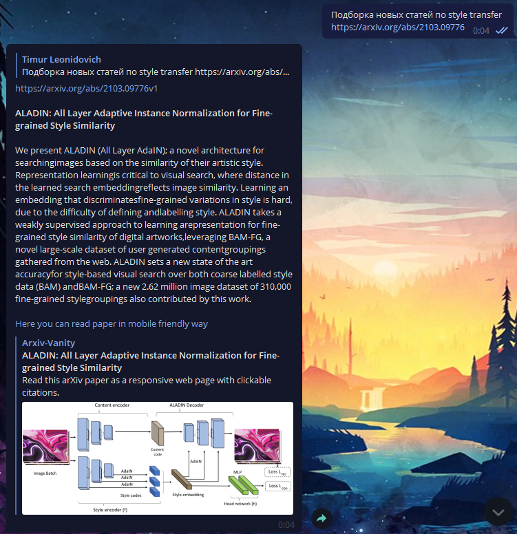 Telegram for some reason doesn't show snippets for links from arxiv.org site. This bot created to get work around of this problem. It is useful to having this bot in chats where you can share links from arxiv and bot will replying on that messages with some kind of snippets with title and description of paper and link to mobile friendly service for arxiv papers - arxiv-vanity.com